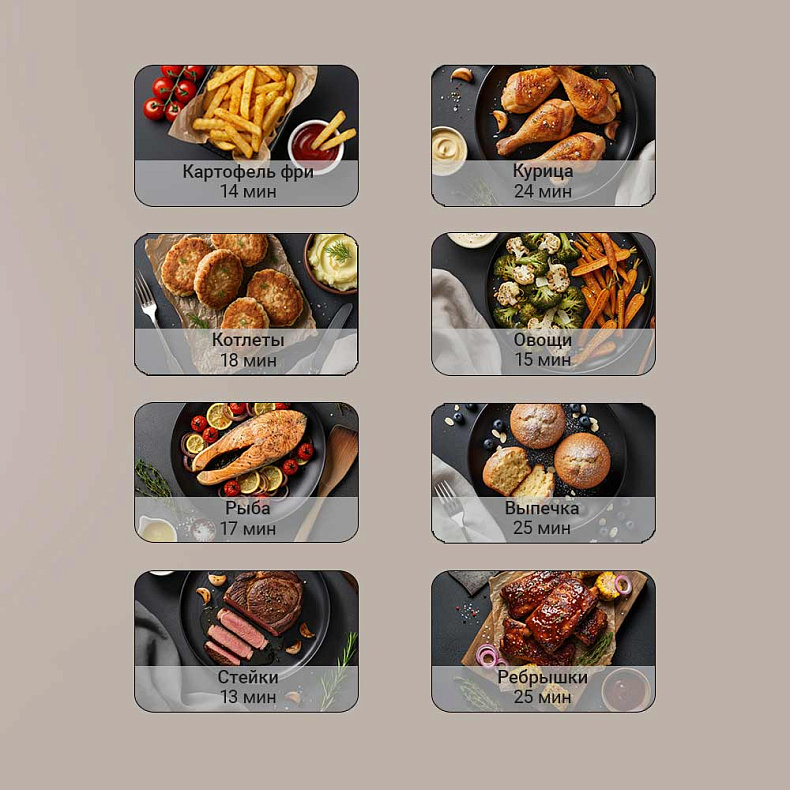 Восемь автоматических программ позволяют быстро и просто готовить самые разные блюда — от стейков и картофеля фри до рыбы и выпечки. Аэрогриль сам установит оптимальные параметры, а вам остается только загрузить продукты и выбрать иконку нужного продукта.
