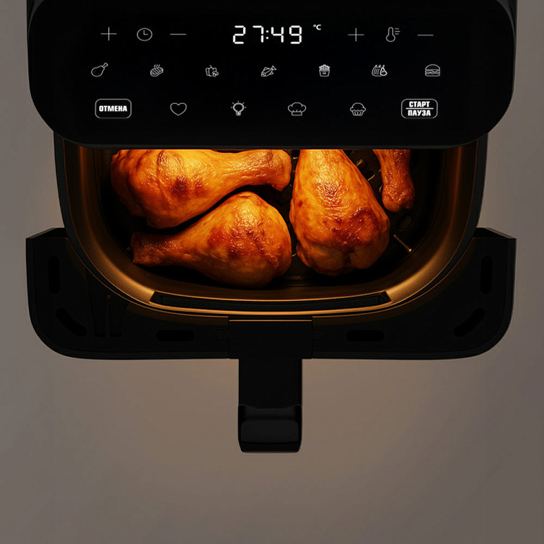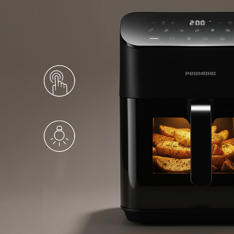 Все просто и понятно с первого раза. Интуитивное сенсорное управление позволяет легко начать пользоваться аэрогрилем без лишних настроек. Подсветка камеры помогает визуально контролировать процесс приготовления блюда на каждом этапе.