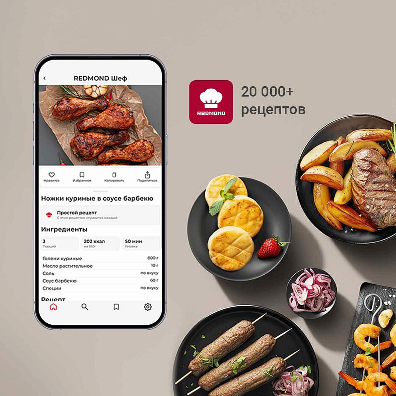 В приложении REDMOND Шеф вы найдете подборку фирменных рецептов на каждый день — от классических блюд до оригинальных идей для ужина или праздника. Рецепты из электронной кулинарной книги разработаны специально для этой модели аэрогриля, поэтому вы можете быть уверены в результате.