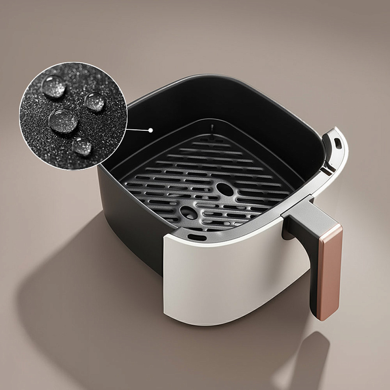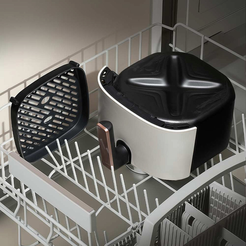 Конструкция аэрогриля продумана для комфорта использования. Основные рабочие элементы — съемная чаша с покрытием Mineral Pro и решетка — легко очистить вручную или поместить в посудомоечную машину. Это решение экономит время и превращает уход в простую задачу.