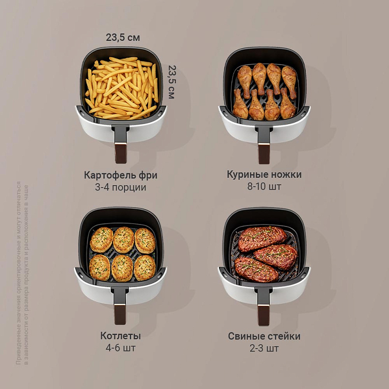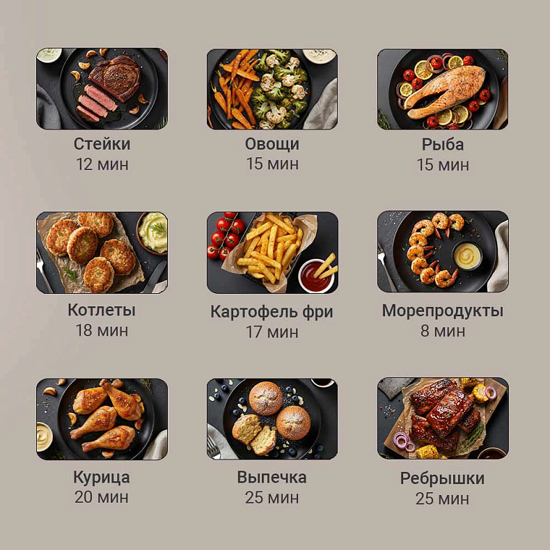 Аэрогриль помогает на всех этапах — от подготовки до подачи. Помимо основных программ, аэрогриль оснащен полезными функциями: