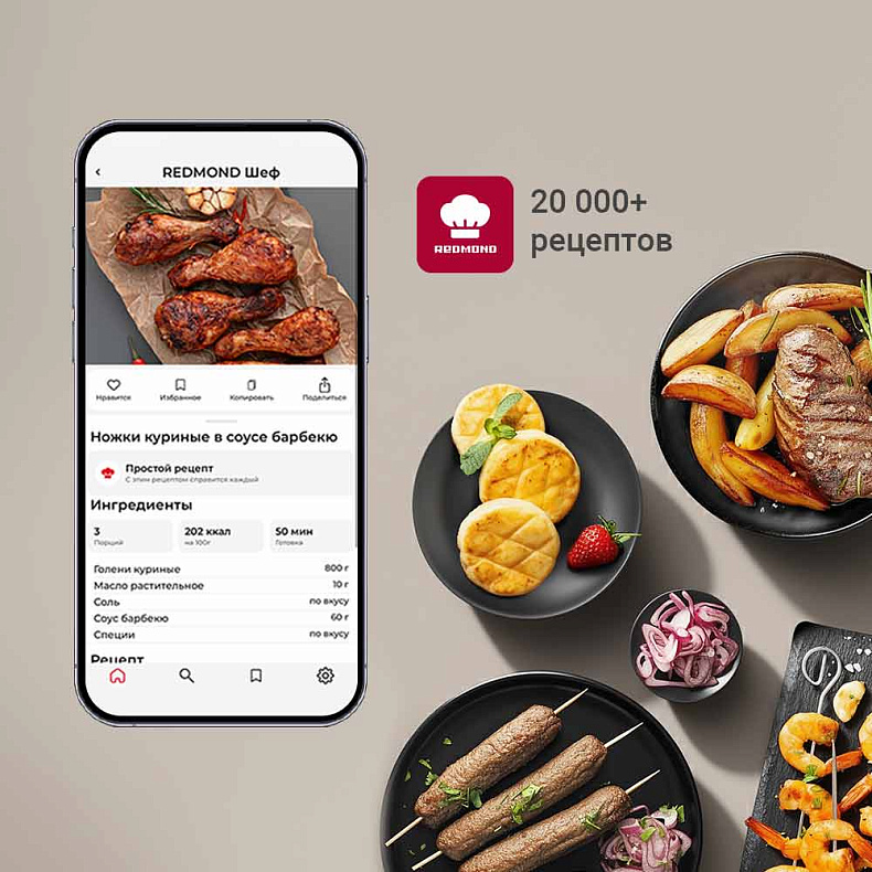 В приложении REDMOND Шеф доступно более 20 000 уникальных рецептов для аэрогриля и других наших устройств. Вы получаете готовые идеи для простых и изысканных блюд и точные параметры приготовления — от температуры до времени. Это упрощает эксперименты и гарантирует стабильный результат.