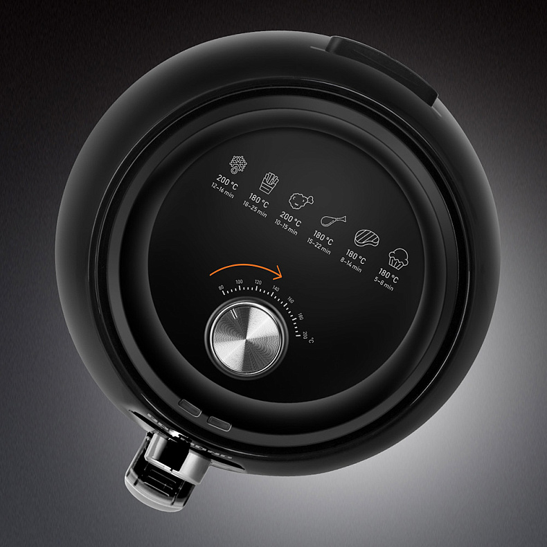Аэрогриль готовит блюда при температуре от 80 до 200 градусов. Вы можете сами ее регулировать, чтобы получить нужный результат.