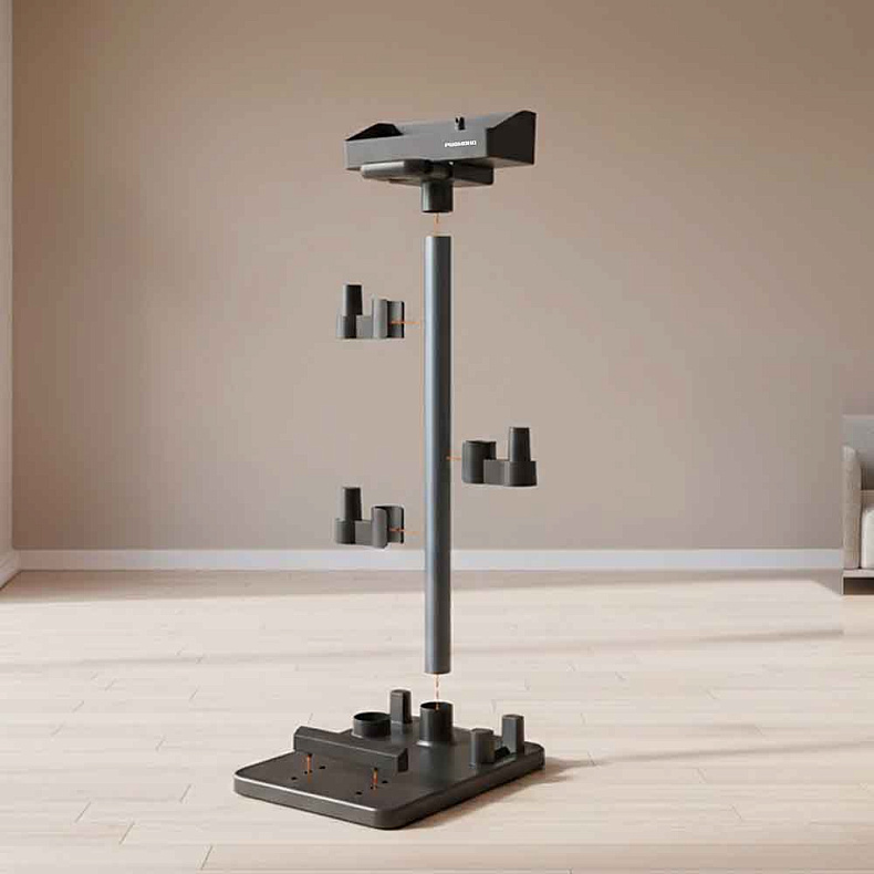 Стойка изготовлена из прочного пластика, рассчитанного на длительный срок службы, и быстро собирается из нескольких элементов. Соединение деталей интуитивно понятное и не требует специальных инструментов, поэтому установить подставку можно всего за несколько минут.