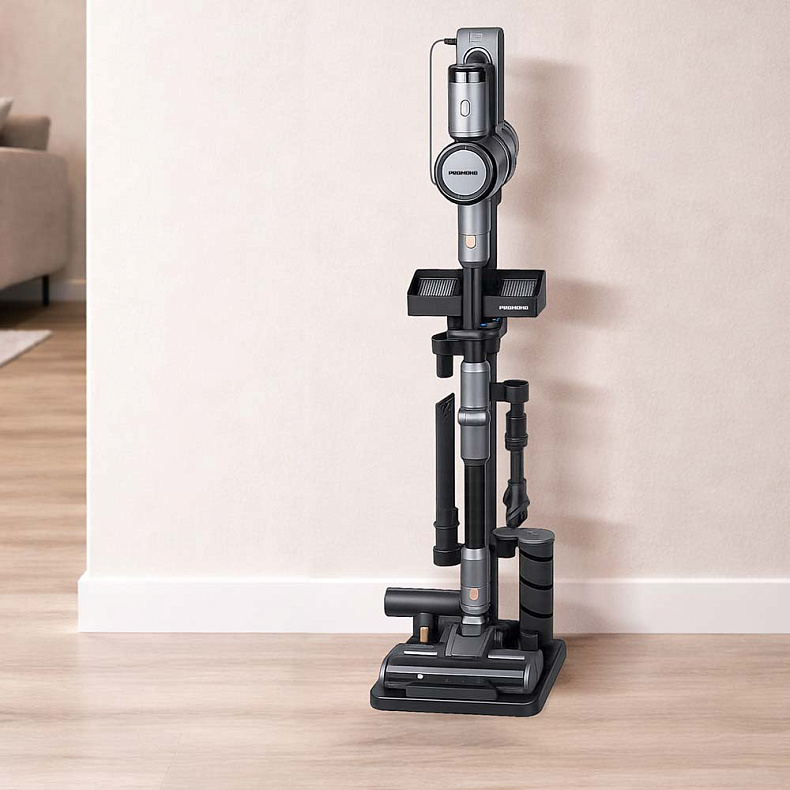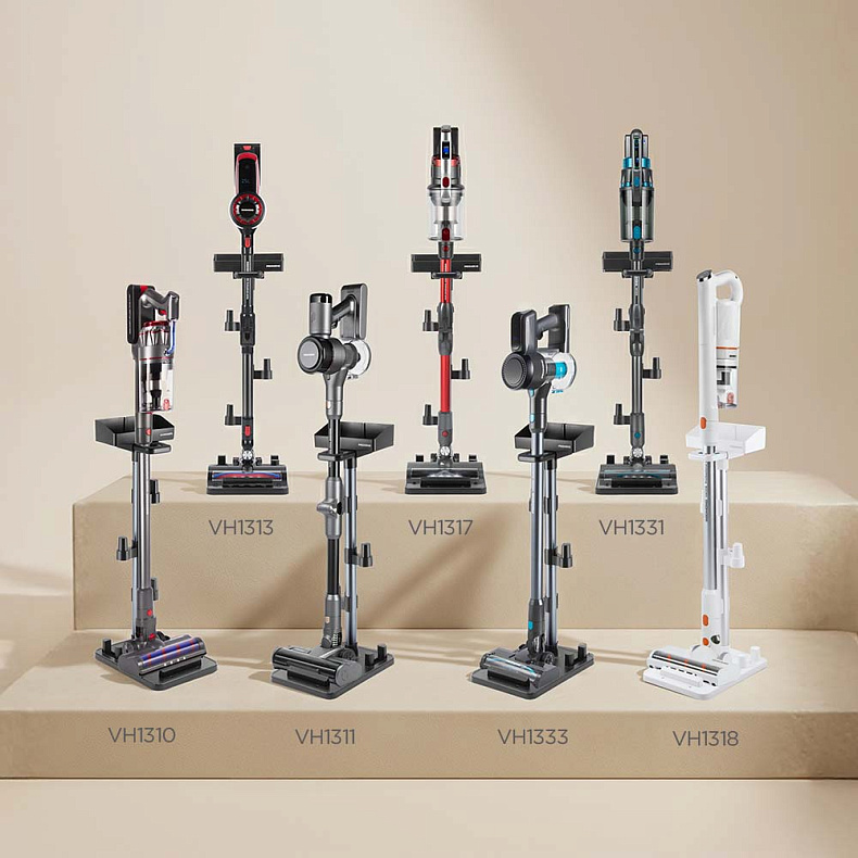 Универсальная подставка создана для того, чтобы компактно разместить вертикальный пылесос и комплект аксессуаров в одной зоне. Больше не придется прятать насадки в шкаф — все необходимое всегда под рукой и готово к использованию.