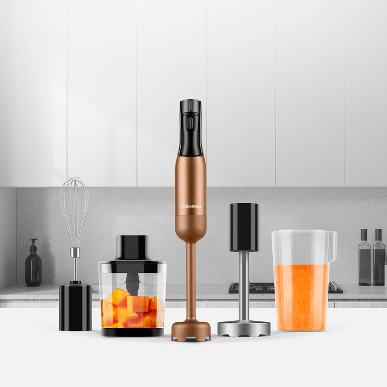 Блендер BH403 выполнен в трендовом бронзовом дизайне — и входит в коллекцию техники Peach Bronze. Он сочетает стиль и функциональность, как и другие приборы из этой линейки: гриль GM303, электрический чайник KM240, кофеварка CM720, кухонная машина FM615 и комбайн FP608, а еще тостер T901 и мультиварка RMC-450.