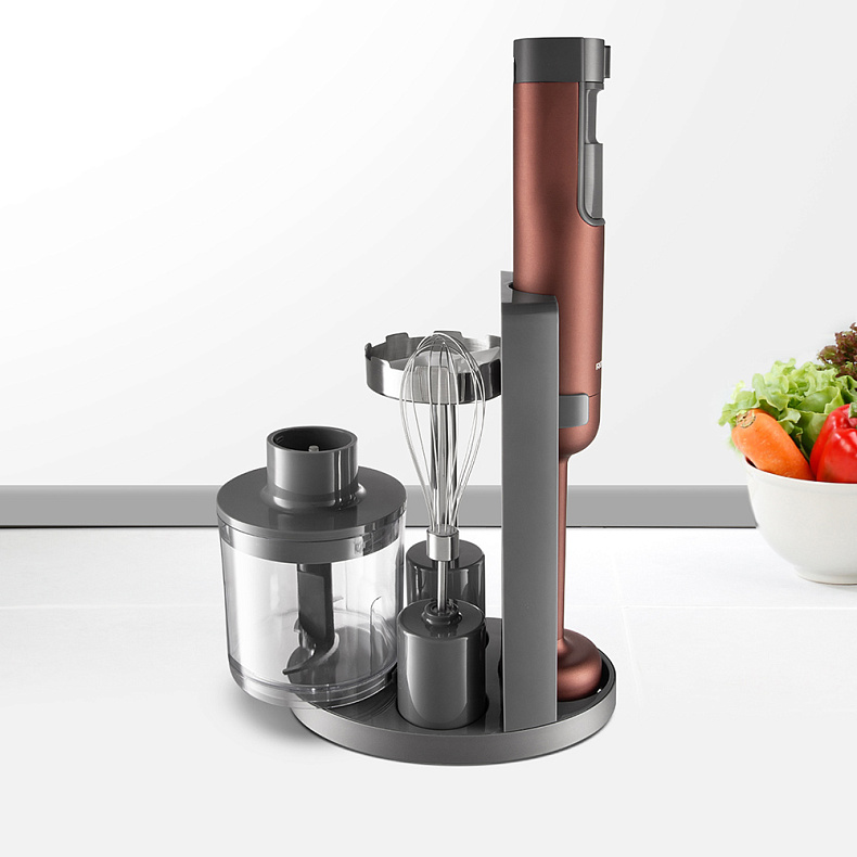 Предусмотрели удобную систему хранения прибора и сменных насадок. Блендер можно установить на стильную подставку, и он всегда будет на столе под рукой.