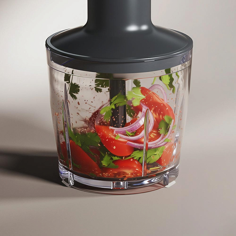 Чаша измельчителя 500 мл подходит для приготовления соусов и небольших порций, а стакан 600 мл — для смузи, коктейлей и супов-пюре. Продуманная вместимость обеспечивает удобство использования без переполнения. Наличие мерной шкалы на емкостях позволяет точно соблюдать пропорции ингредиентов без использования дополнительных аксессуаров.