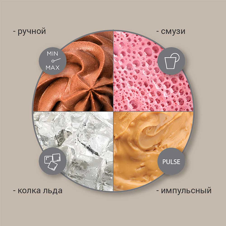 В ручном режиме вы сможете плавно наращивать скорость для более качественного измельчения ингредиентов. Управлять блендером несложно: достаточно повернуть регулятор, чтобы ускорить работу BS413.