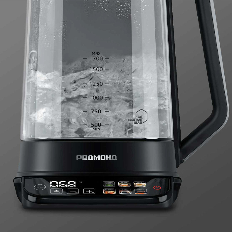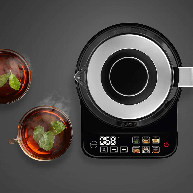 Чайник отличается строгим дизайном. Его корпус сделан из качественных материалов: металла, жаропрочного стекла, пластика. Цветная сенсорная панель позволит выбрать режим нагрева одним касанием.