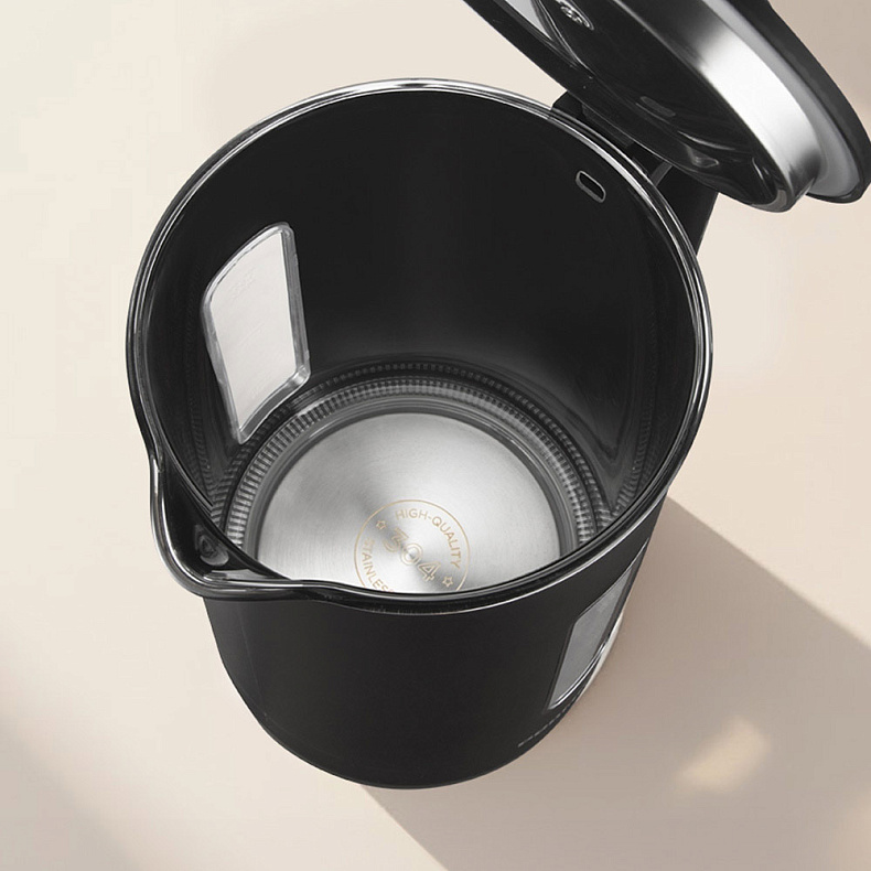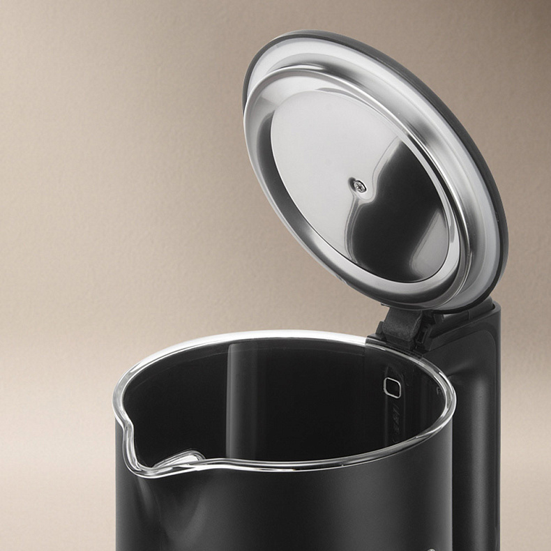 Несмотря на компактные размеры, чайник вмещает 1,5 литра воды — этого достаточно для 5–6 чашек напитка. Широкая и удобная шкала уровня воды, расположенная по обеим сторонам, позволяет точно контролировать количество жидкости.