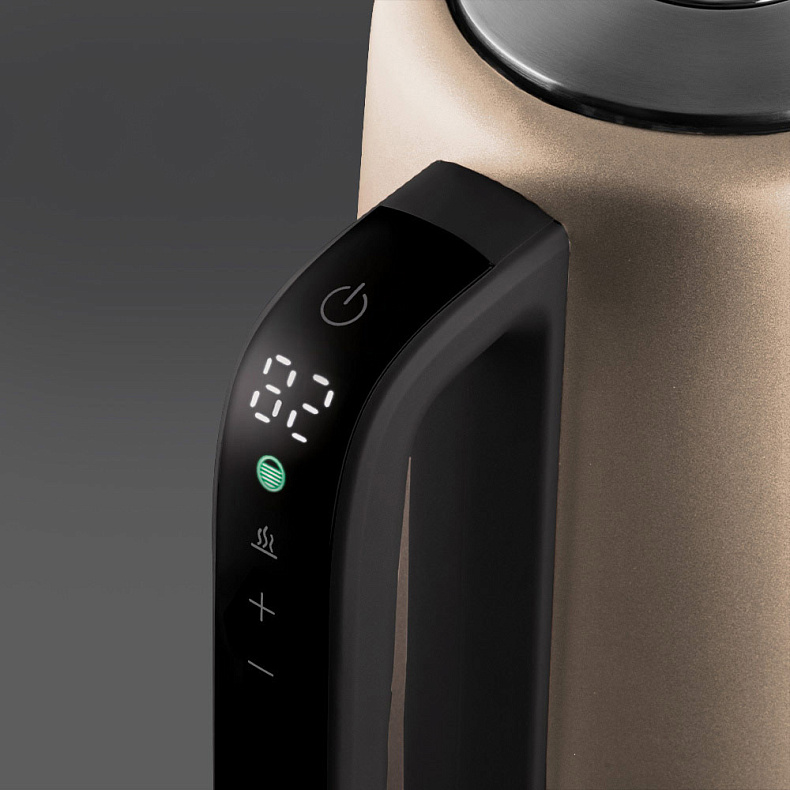 Ручка чайника оснащена сенсорной панелью управления. Она удобна в использовании и позволит запустить кипячение или выбрать настройки кипячения с подогревом в одно касание.