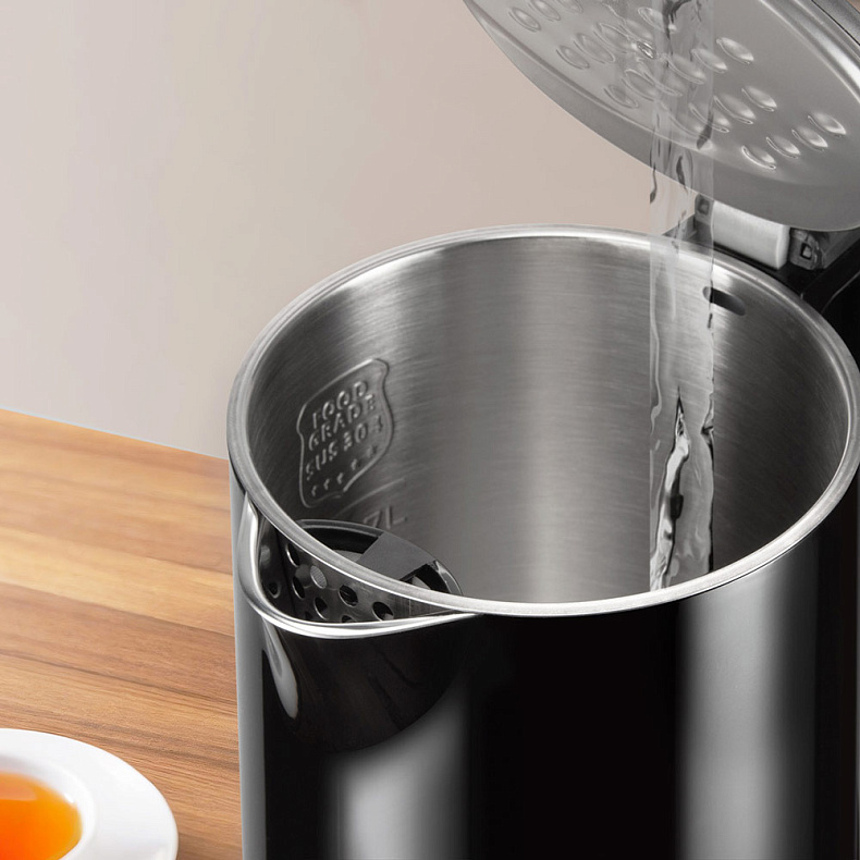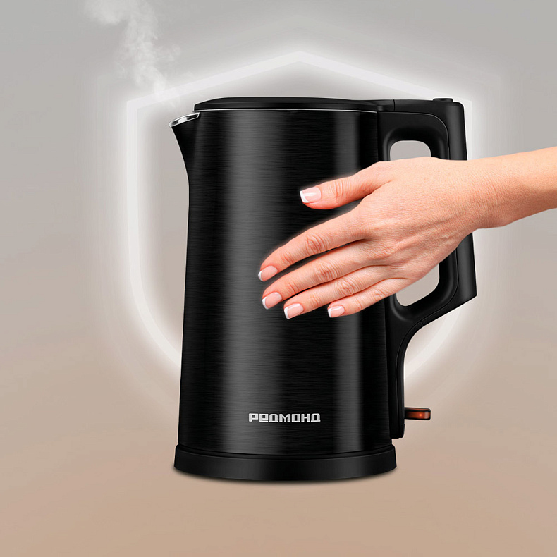 Двойные стенки чайника создают эффект термоса. Воздушная прослойка между стенками не дает нагреться внешней части корпуса, при этом сохраняет тепло внутри.