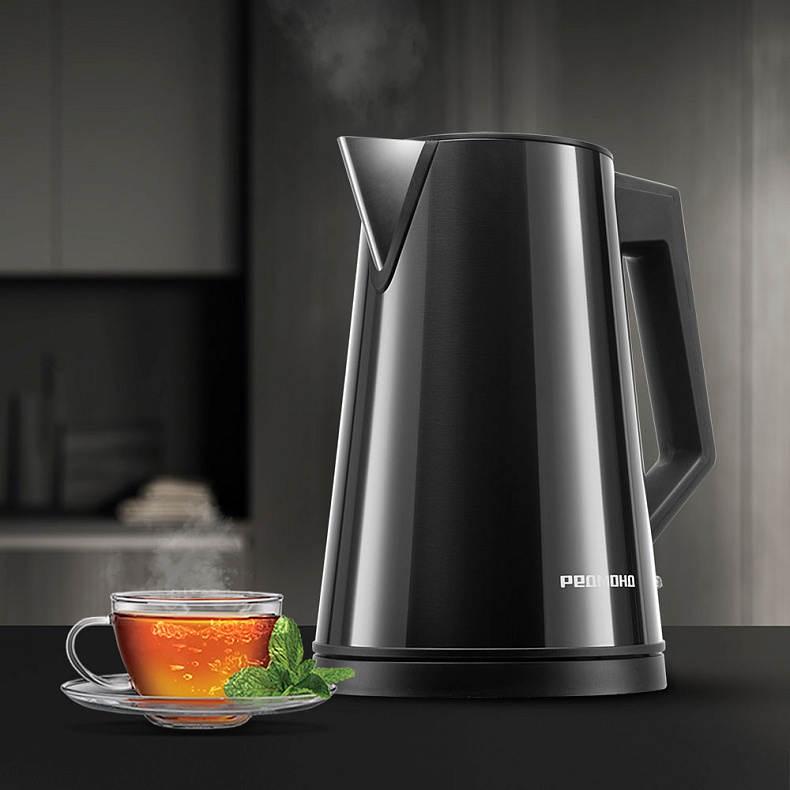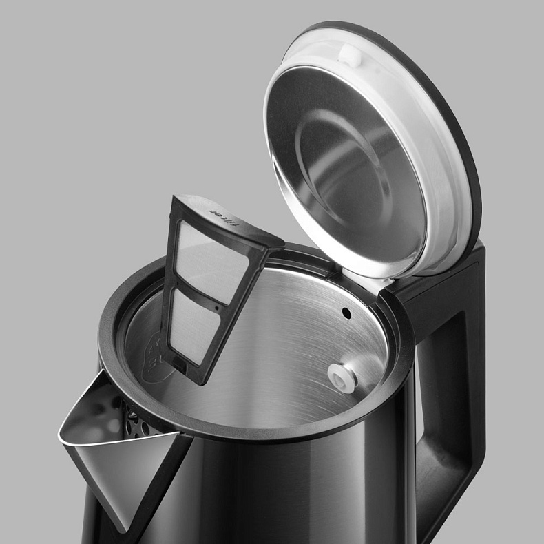 Чайник имеет двойные металлические стенки. Между ними остается воздушная прослойка, которая создает эффект термоса и не позволяет воде долго остывать. Внешняя поверхность не нагревается — при случайном прикосновении к чайнику нельзя обжечься.