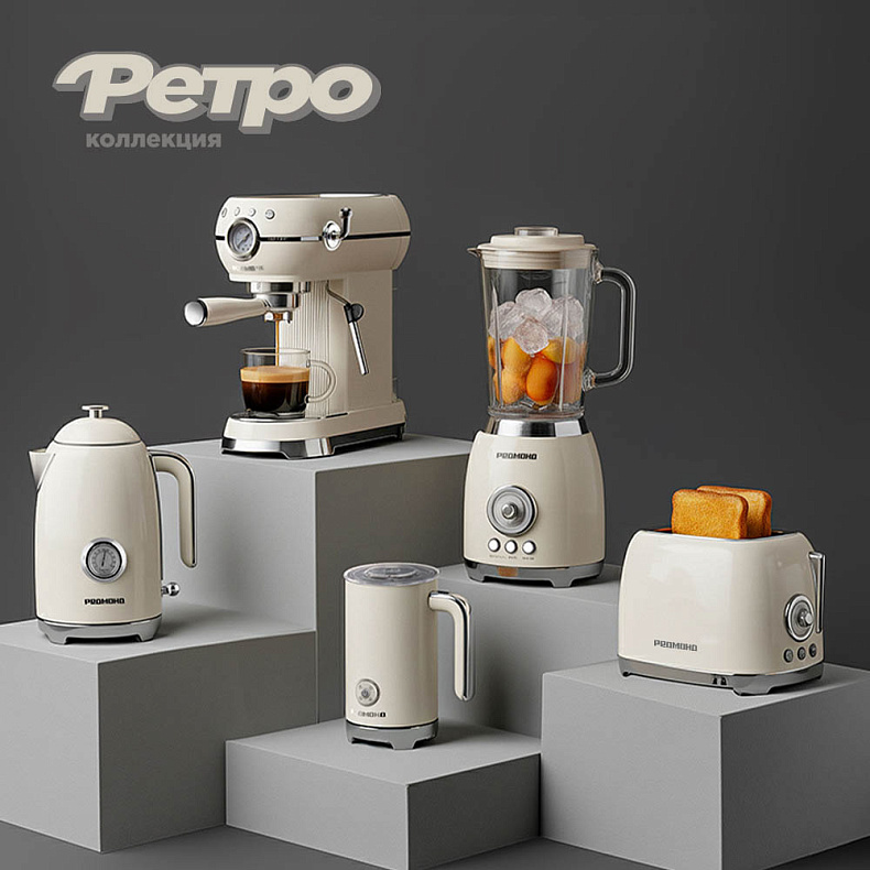 Техника в стиле ретро понравится тем, кто ценит не только функциональность, но и дизайн. Она дополнит интерьер, придав кухне особый шарм. Используйте блендер BS413, чайник KM247, тостер T909, кофеварка CM722 и капучинатор MF5002, чтобы приготовить идеальный завтрак.