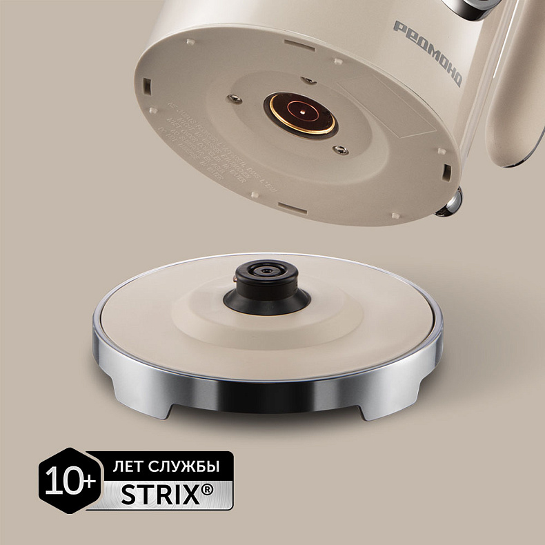 В подставку чайника встроен контроллер Striх® от британского производителя. Контактная группа известна своей надежностью — с ней прибор прослужит вам долго без поломок и дорогостоящего ремонта.