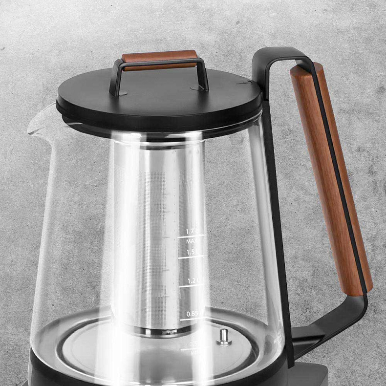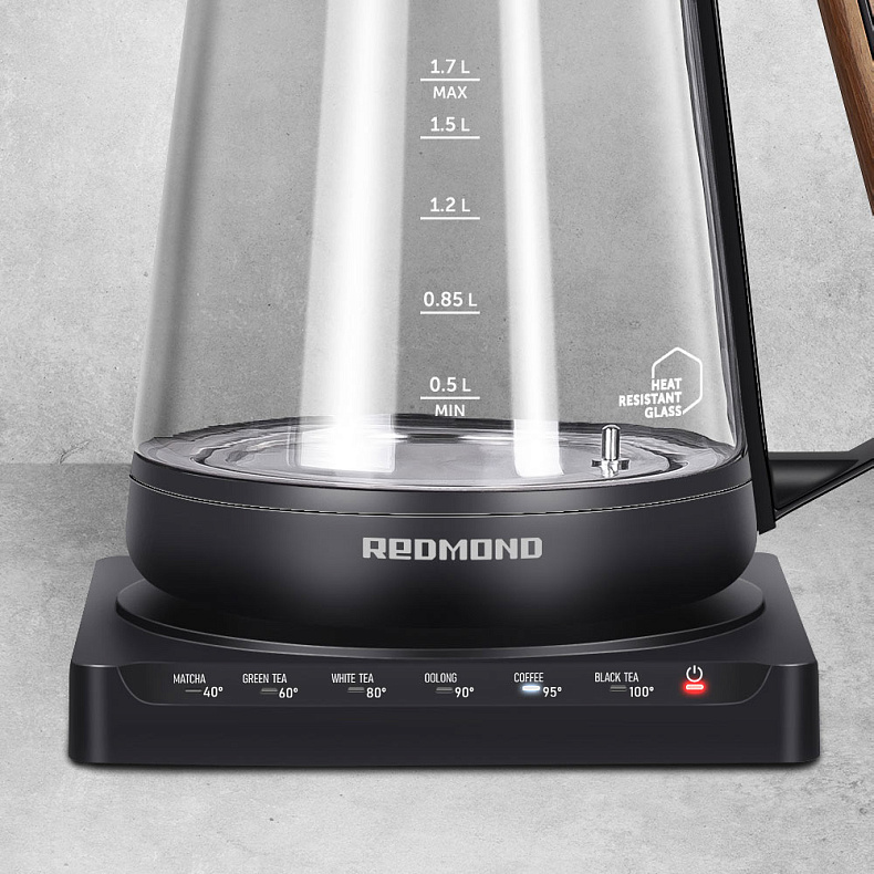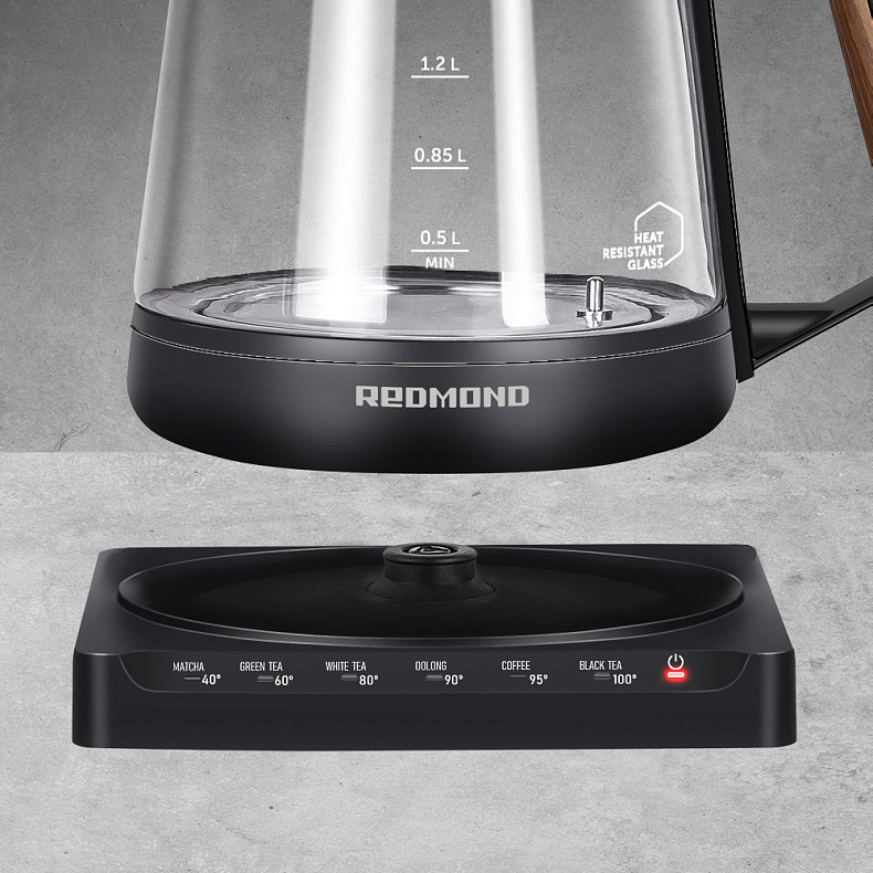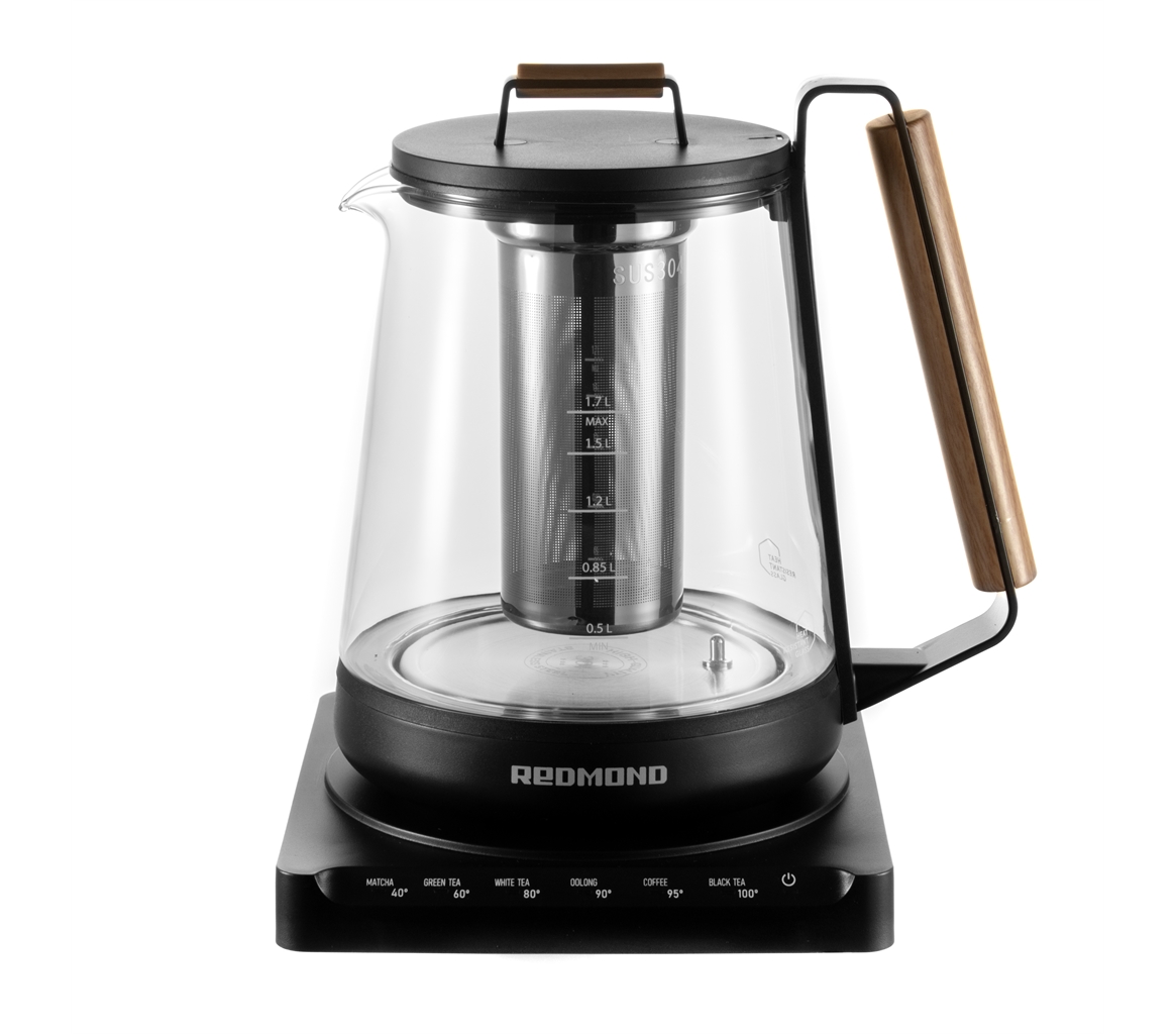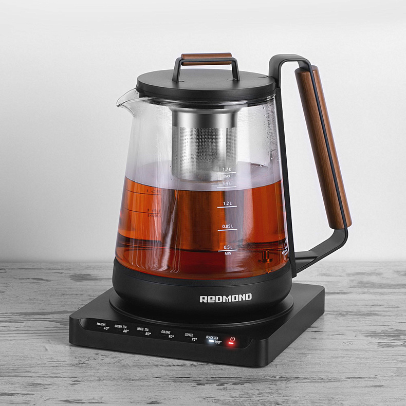 "Интересное решение от компании Редмонд — чайник с колбой для заваривания чая. Выполнен в черном цвете с ручкой из темного дерева, чем-то навевает азиатский стиль.