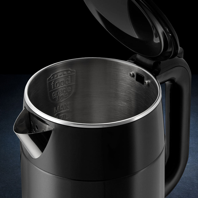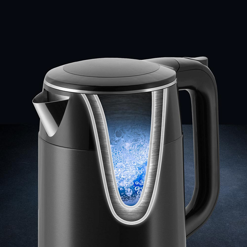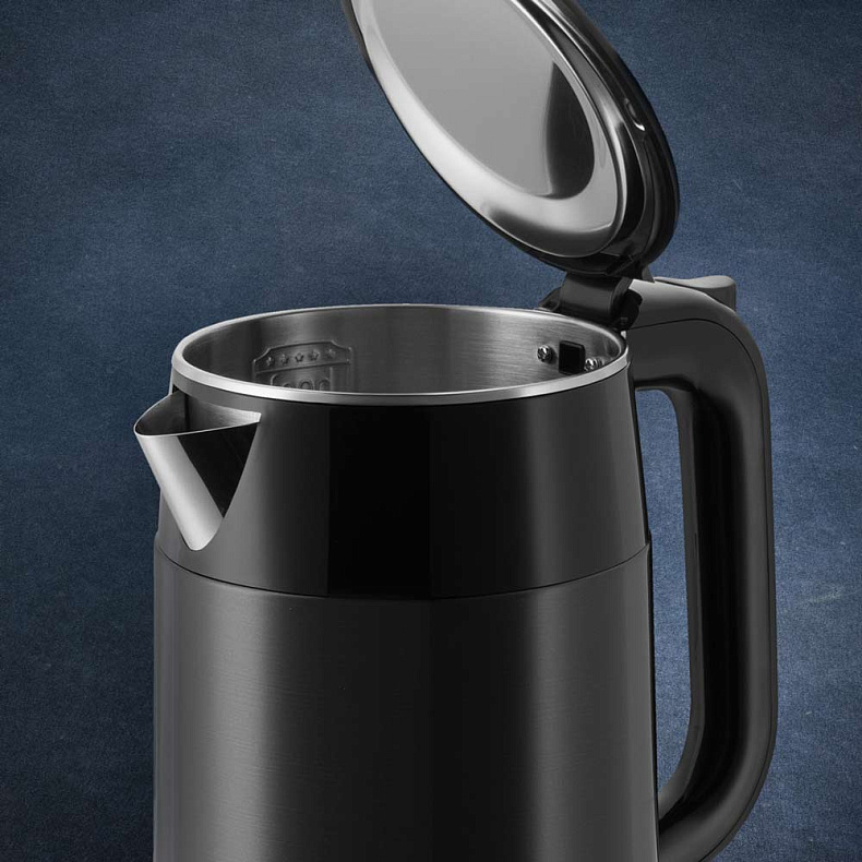 Адиабатный корпус работает как термос — вода долго остается горячей благодаря воздушной прослойке между внутренней колбой и корпусом. Обжечься о чайник нельзя — снаружи он не нагревается.