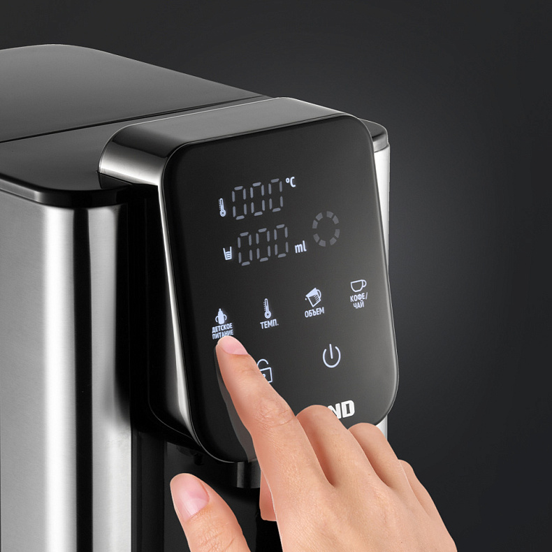 Большой объем термопота, вода нагревается моментально, есть 6 разных температур. Сенсорное управление, реагирует на касание. Резервуар для воды снимается и моется. Понравилось, что есть датчик наличия воды, защищает термопот от нагрева без воды.