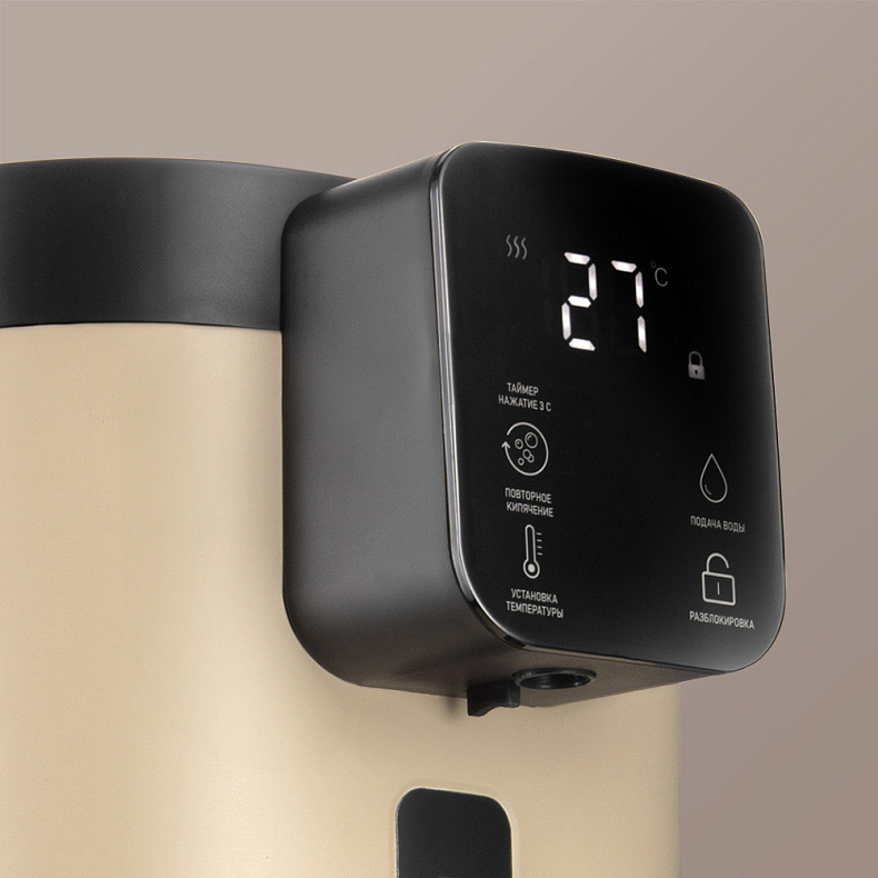 Прибор автоматически отключится при перегреве или если в термопоте критически мало воды. А еще предусмотрена блокировка подачи воды от детей, чтобы избежать риска случайных ожогов.