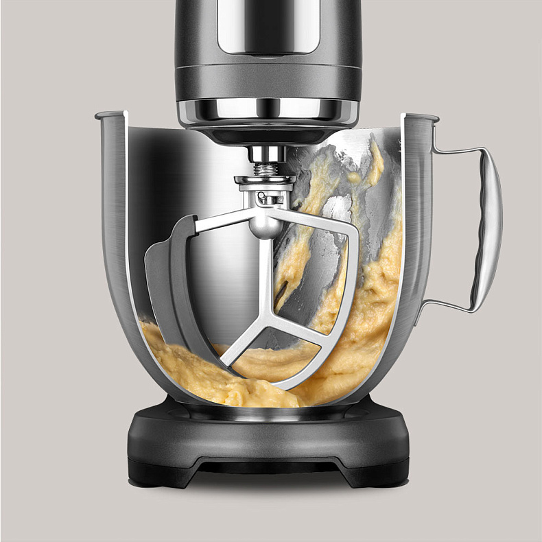 Широкий силиконовый край не поцарапает чашу и ускорит смешивание, поскольку захватывает больше теста. Если отсоединить насадку, ей можно согнать жидкое тесто в форму, не расплескав ни капли.