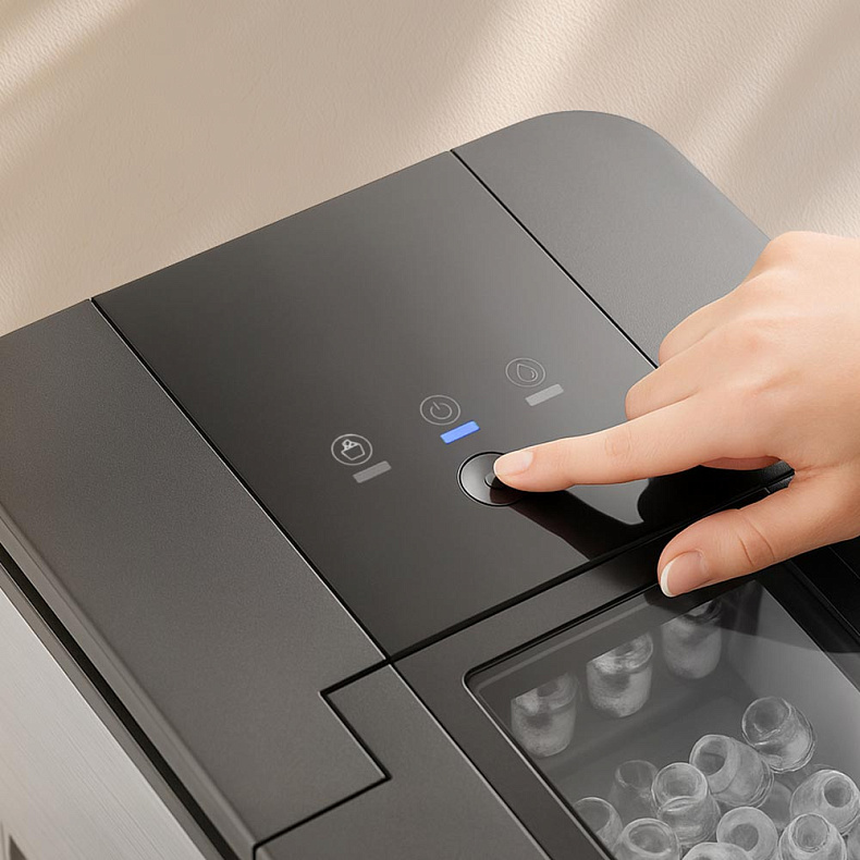 У IM6201 нет сложной панели управления, для работы достаточно нажать одну кнопку. Вы сможете начать и остановить генерацию льда, включить режим самоочистки. А яркая и понятная индикация даст вам полную информацию о статусе работы устройства.