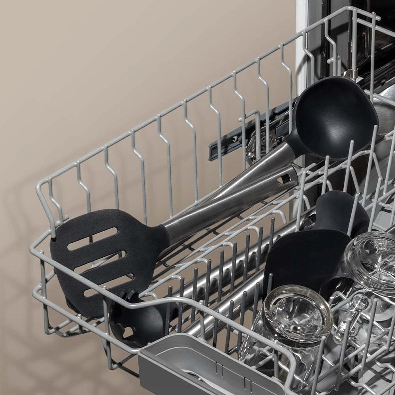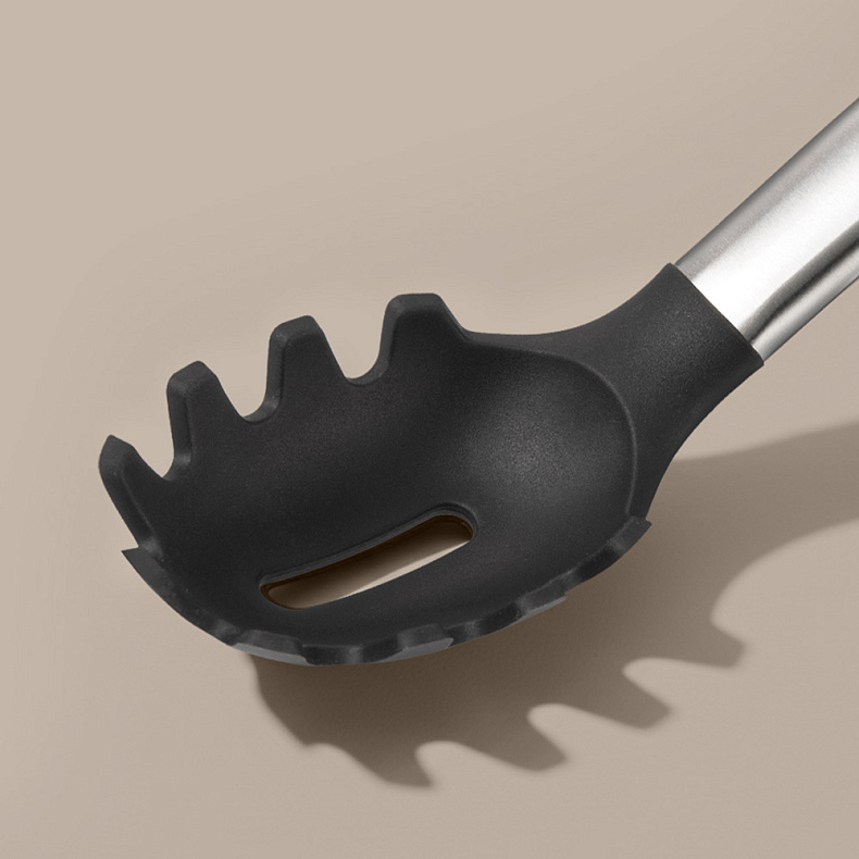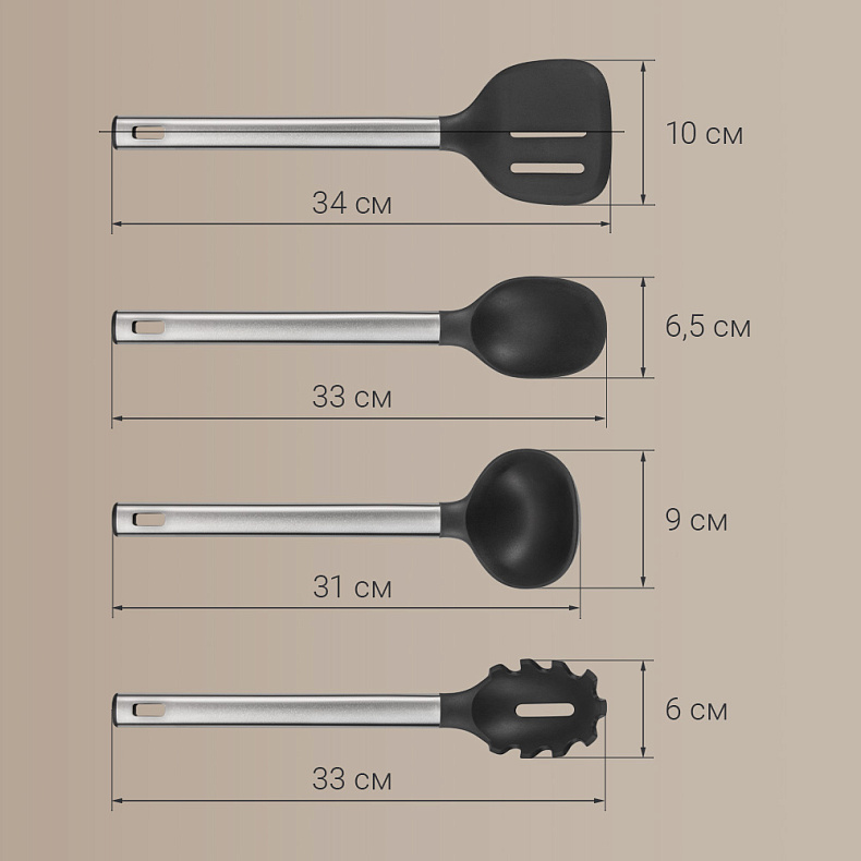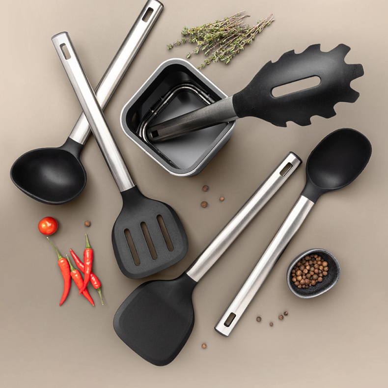 В набор входят половник, ложка, лопатка, лопатка с прорезями, ложка для спагетти и стакан-подставка. Такой комплект закрывает основные задачи на кухне — от приготовления супов и гарниров до жарки и сервировки.