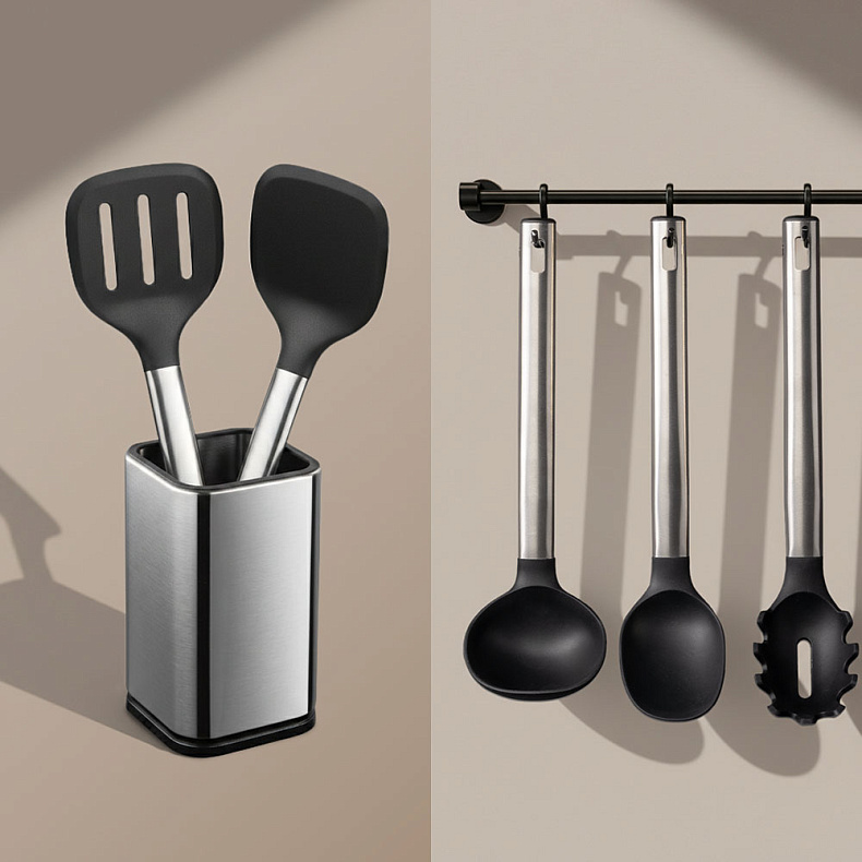 Инструменты можно хранить в стильном стакане-подставке на столешнице или подвешивать на рейлинге — для этого есть специальные отверстия. Это позволяет поддерживать порядок и быстро находить нужный аксессуар во время приготовления.