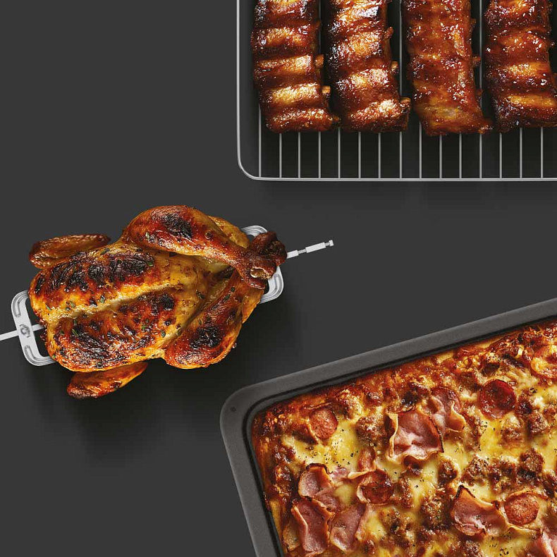 Духовой шкаф с функцией гриля и приготовление на вертеле обеспечивают равномерное запекание без пересушивания продуктов. Мясо и птица получаются сочными. Блюда как из ресторана — прямо у вас на кухне.