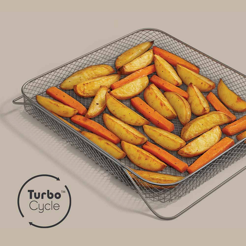 За счет мультиконвекции, интенсивной циркуляции горячего воздуха, продукты готовятся быстрее и равномернее. Технология Turbo Cycle сохраняет мягкость внутри, при этом снаружи образуется хрустящая корочка. Получайте аппетитный результат без лишнего масла.