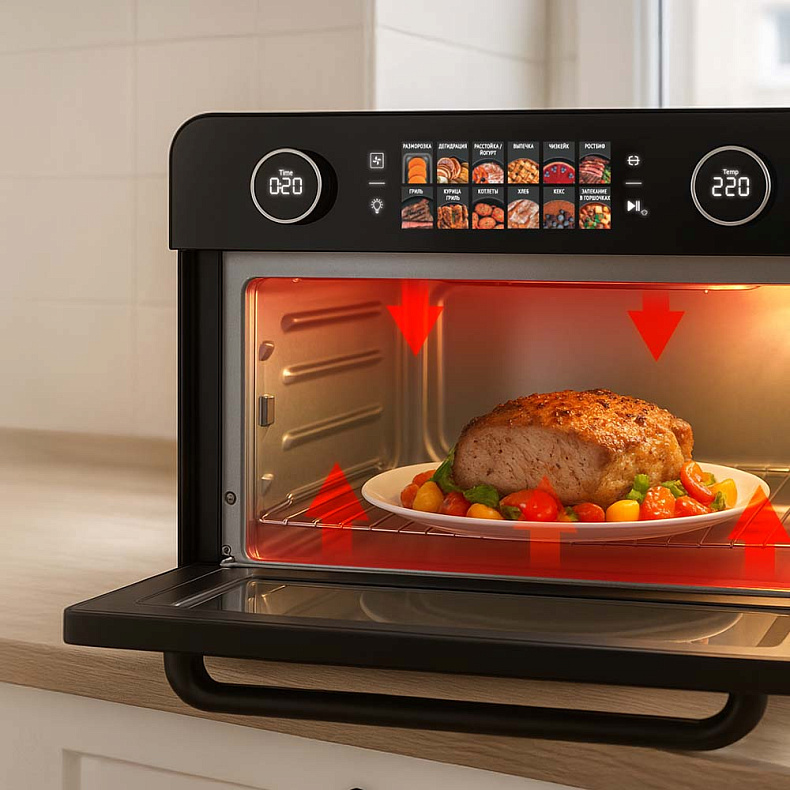 Прибор оснащен тремя режимами нагрева, которые позволяют точно подобрать способ приготовления под любое блюдо. Верхний нагрев создает аппетитную румяную корочку, подчеркивая вкус и текстуру. Нижний идеально подходит для печенья, пиццы, длительного томления или аккуратного разогрева без пересушивания. Комбинированный режим обеспечивает равномерную готовку, помогая блюдам пропекаться идеально со всех сторон.