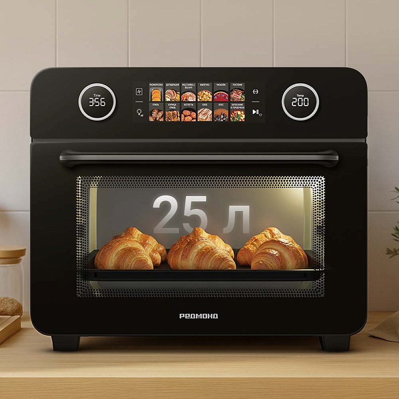 РЕДМОНД OV2100 заменит шкаф духовой, аэрогриль и дегидратор. Один прибор выполняет функции сразу трех устройств. Это экономит место и расширяет возможности на кухне. Идеально для тех, кто ценит универсальность и порядок. Объем камеры 25 литров подходит для готовки на всю семью. При этом духовой шкаф компактный — найдется место даже на небольшой кухне.