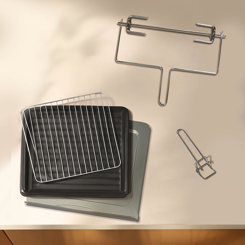 В комплект входят противень, решетка и вертел. Все необходимое уже есть для разных способов приготовления. Вам не нужно покупать дополнительные аксессуары отдельно.