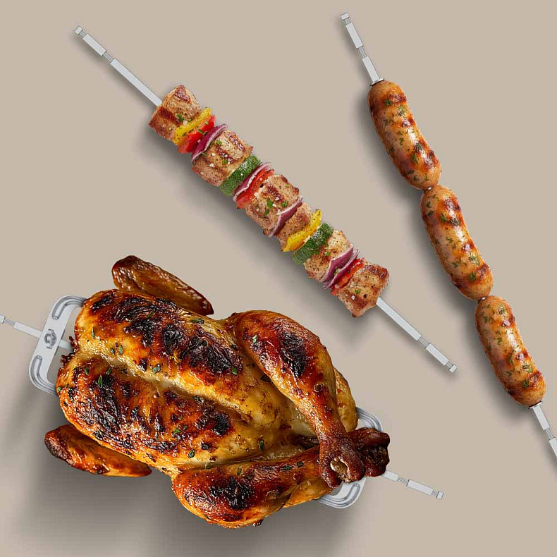 Готовьте на вертеле с функцией гриль разнообразные продукты. Курица, крылышки, шашлык, купаты, колбасы, овощи получатся идеальными. Блюда приобретают ресторанный вкус прямо у вас дома. Это идеальное решение для любителей стейков и запеченных деликатесов.