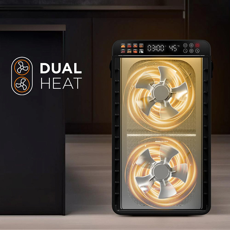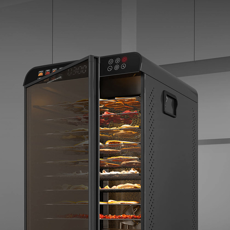 Система двойного горизонтального обдува обеспечивает циркуляцию горячего воздуха с двух сторон. Это гарантирует, что на всех 12 уровнях продукты просушатся одинаково тщательно и быстро, без необходимости менять поддоны местами. Ваши яблочные дольки будут одинаково хрустящими.