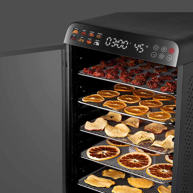 Яркий цветной дисплей и сенсорные кнопки делают управление простым и удобным. 8 автоматических программ уже настроены для популярных продуктов: фрукты, овощи, мясо, рыба, травы и другие. Вам не нужно запоминать время и температуру — просто выберите нужный режим, и дегидратор все сделает сам.