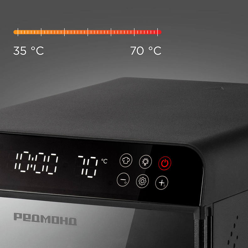 Широкий диапазон регулировки температуры от 35 до 70 °C — залог правильного результата. Травы требуют деликатной сушки при 35–40 °C. Для сочных фруктов и овощей идеальна температура около 60 °C. А для быстрого приготовления сухариков или вяления рыбы можно выставить максимальные 70 °C.