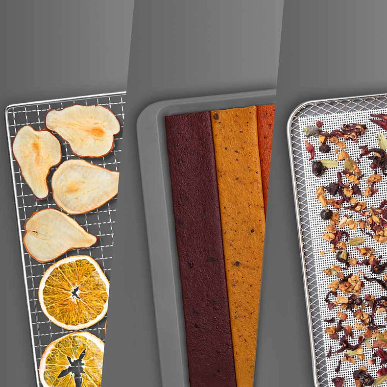 В набор входят 12 решеток для стандартной сушки, 6 специальных поддонов для пастилы и 6 мелких сеток для трав и ягод. Такое разнообразие позволяет использовать прибор с максимальной эффективностью. Вы можете одновременно сушить грибы на решетках, готовить пастилу на поддонах и раскладывать на сетках пряные травы для чая.