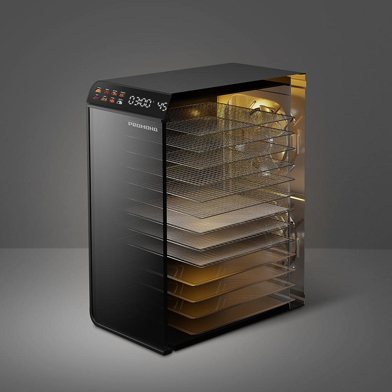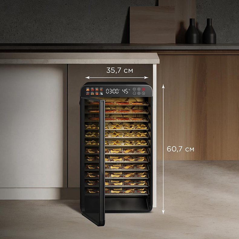 Несмотря на внушительную вместимость, дегидратор имеет эргономичный дизайн и не займет много места на вашей кухне. Его можно убрать в шкаф или разместить под столешницей, где он будет гармонично смотреться благодаря стильному исполнению.