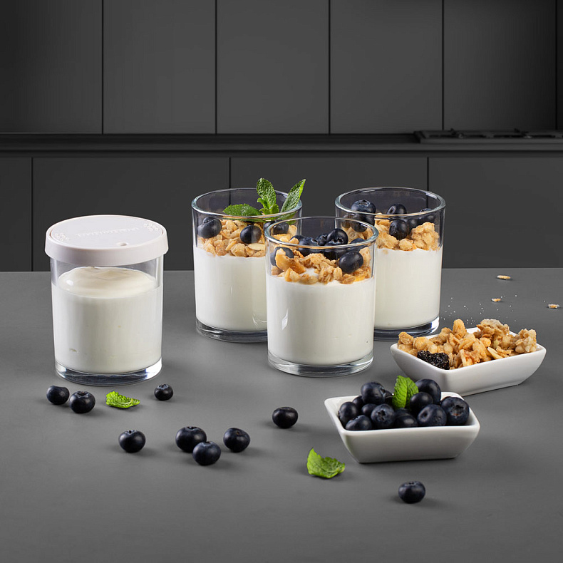 В комплект входят стеклянные баночки для приготовления домашнего йогурта — экологичная и удобная альтернатива готовым вариантам в пластике. Вы можете самостоятельно регулировать состав и добавлять любые ингредиенты по своему вкусу. Готовый йогурт удобно хранить прямо в этих же баночках.