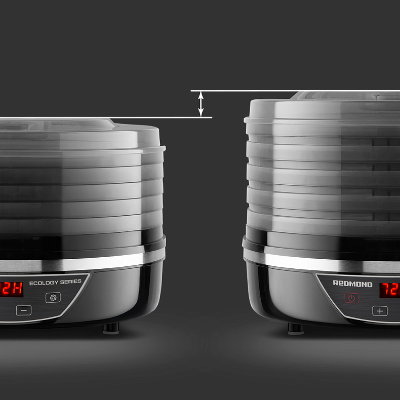 Вы сможете высушить как более крупные овощи и фрукты, так и более мелкие. Необязательно нарезать все продукты одинаково — специальная конструкция поддонов позволяет делать их ниже или выше.