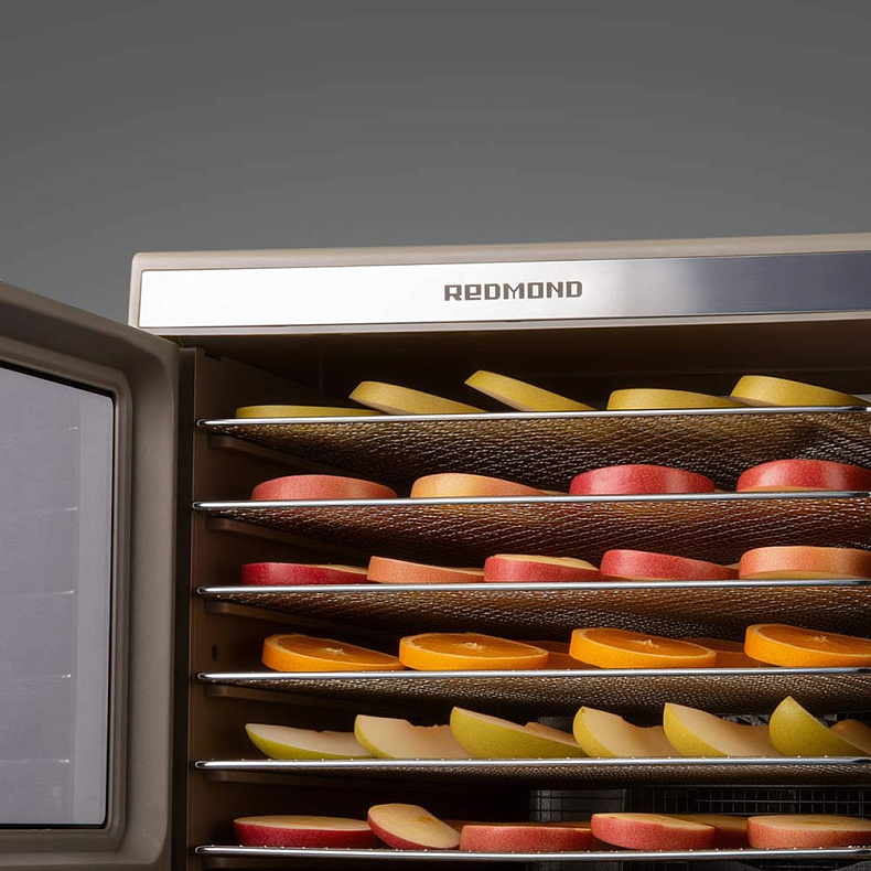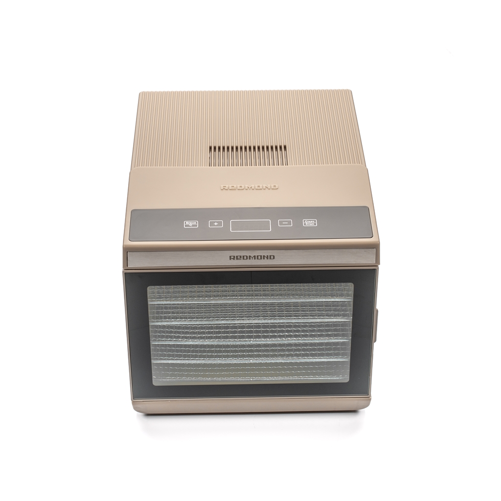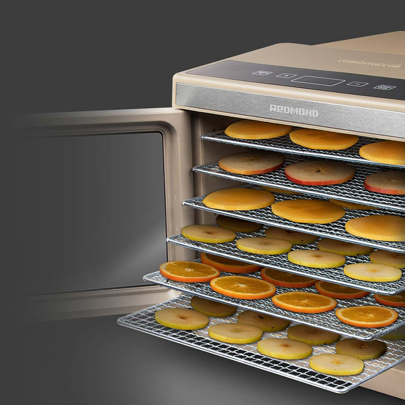 Горизонтальная система обдува обеспечивает циркуляцию горячего воздуха вокруг каждого продукта на всех уровнях. Благодаря этому фруктовые и овощные дольки просушиваются одинаково с обеих сторон, а зелень сохраняет свой естественный цвет и аромат.