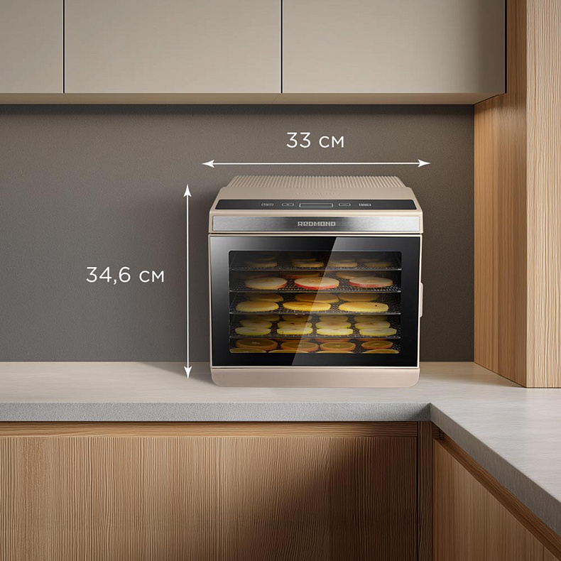 Компактные размеры позволяют легко разместить сушилку на стандартной столешнице. Устройство не занимает много места при хранении, а его лаконичный дизайн гармонично вписывается в интерьер кухни.