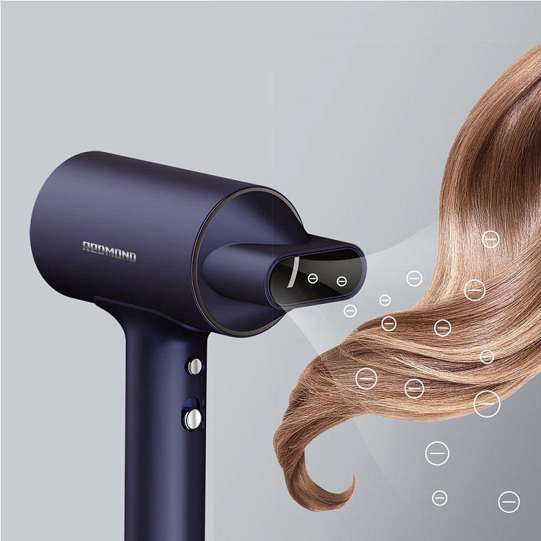 Встроенный ионизатор насыщает поток воздуха отрицательными ионами, которые улучшают состояние волос: