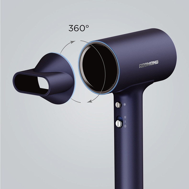 Чтобы установить насадку-концентратор, просто поднесите ее к фену — она сама встанет на место. Магниты позволяют вращать насадку, точечно направляя поток воздуха на нужные пряди.