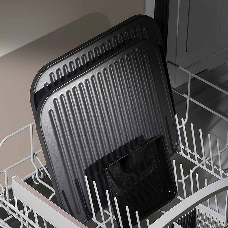 Съемные панели и лоток для сбора жира можно мыть в посудомоечной машине, что сэкономит ваше время и силы. Покрытие панелей не боится перепадов температуры и долго сохраняет антипригарные свойства.
