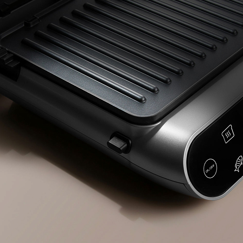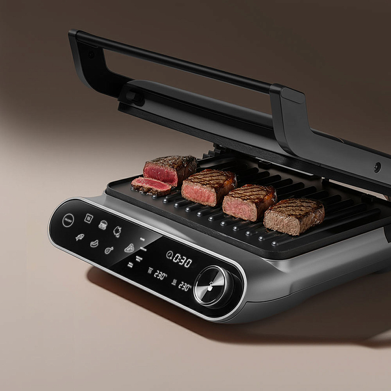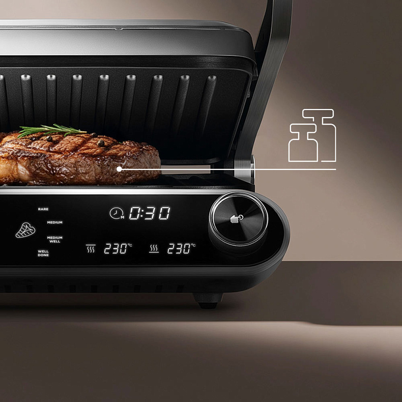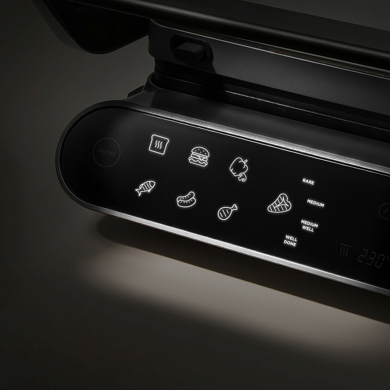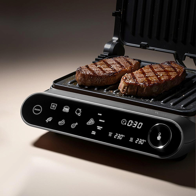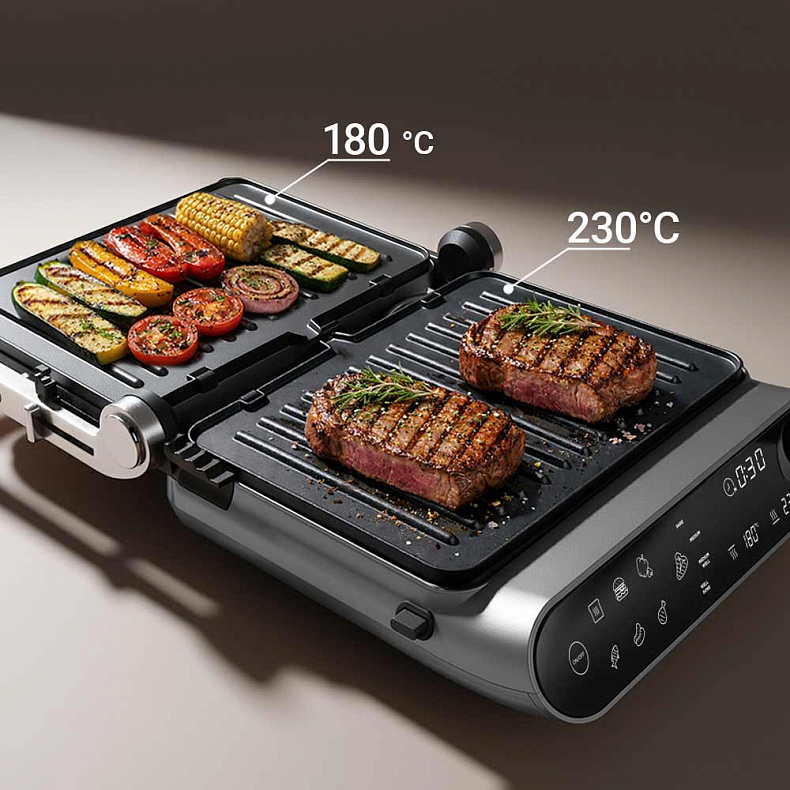 Гриль оснащен таймером и ручной настройкой температуры с шагом в 10 градусов. Каждую панель можно регулировать отдельно, что позволяет готовить несколько блюд одновременно. Идеальное решение для тех, кто любит экспериментировать, а для ценителей — возможность готовить по собственным рецептам.
