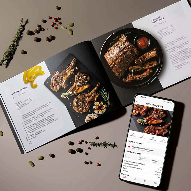 В комплекте — книга рецептов, адаптированная для GM304, и доступ к фирменному приложению REDMOND Шеф, где собрано свыше 20 тысяч различных рецептов, причем не только для гриля. Идеи для завтраков, обедов и ужинов — вы точно найдете вариант на свой вкус.