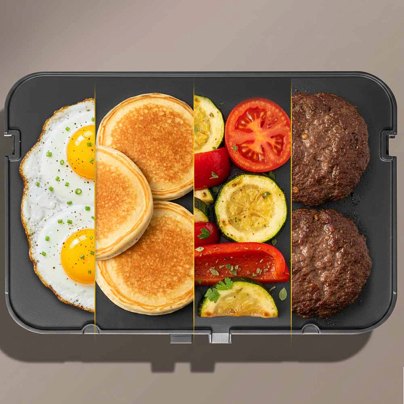 На плоской панели удобно готовить разнообразные блюда: драники и панкейки на завтрак, сырники и яичницу, бекон и тосты, овощи и котлеты для обеда. Одна панель заменяет несколько приборов, экономит время и место на кухне.