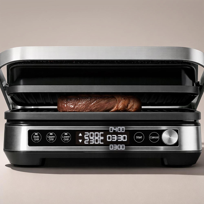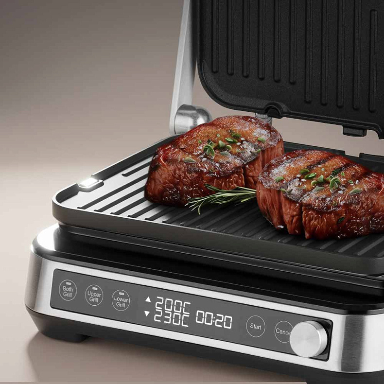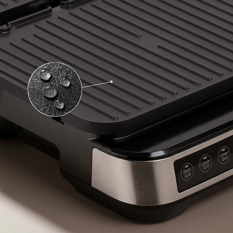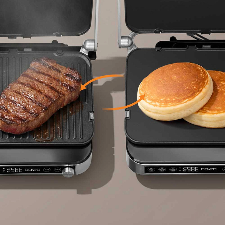 Гриль оснащен двусторонними панелями: одна сторона обеспечивает идеальную рельефную корочку для мяса, рыбы и овощей, другая заменяет сковороду для приготовления более нежных блюд. Панели расположены под наклоном, поэтому лишний сок и жир стекают в поддон, благодаря чему стейк жарится, а не варится, сохраняя максимум сочности.